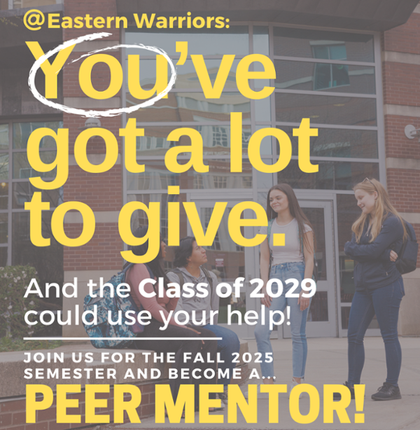 Peer Mentors will assist LAC 101 faculty within their course and serve as advocates for the needs, interests, and rights of first-year students. Peer Mentors are involved in many aspects of LAC 101 (Introduction to the Liberal Arts) course instruction, which may include syllabus planning, facilitating class discussions, and spending out-of-class time with students. The peer mentor role focuses on teaching first-year students about Eastern's resources, helping students to connect with groups on campus, and guiding discussions on college survival skills such as time management, advising, registration, and financial literacy.