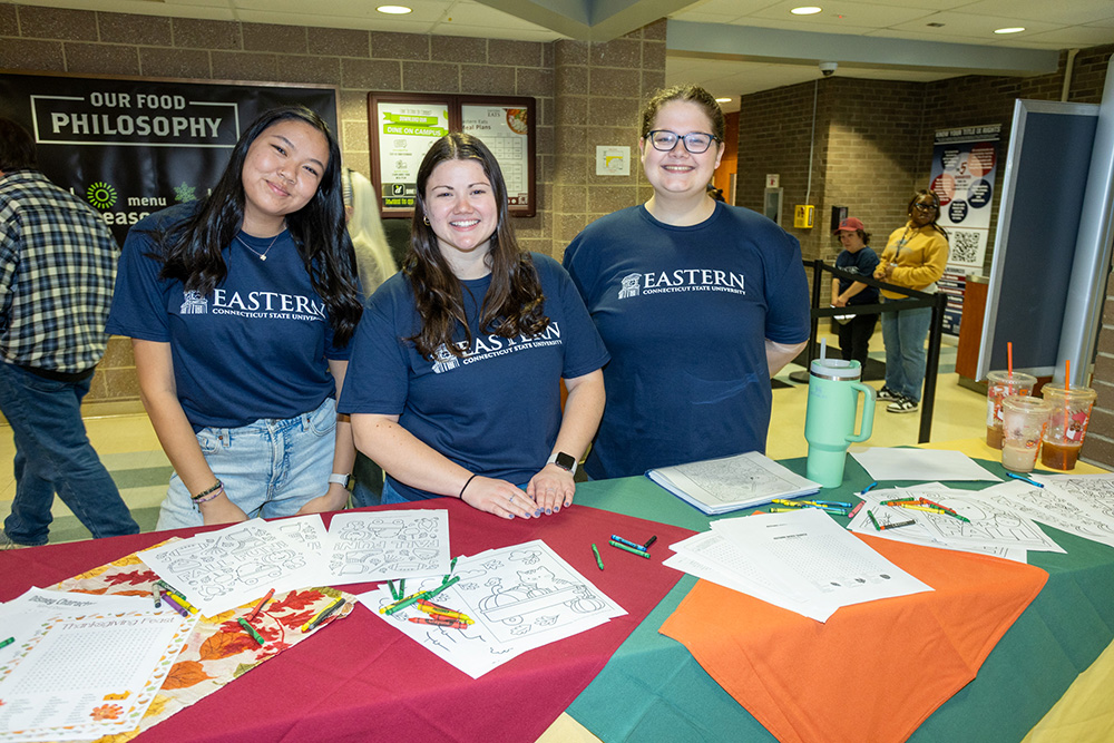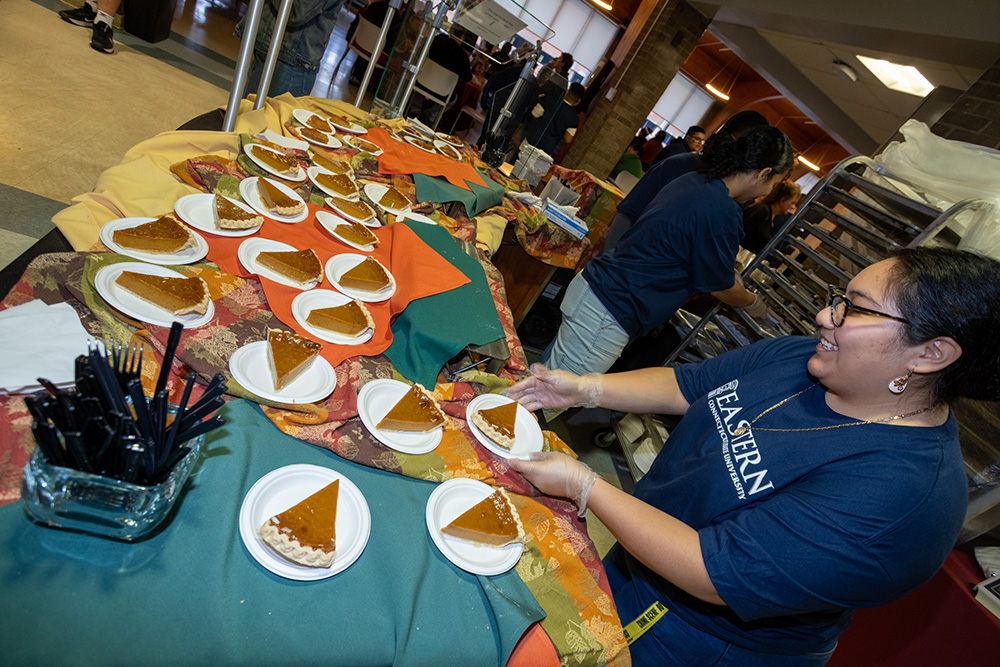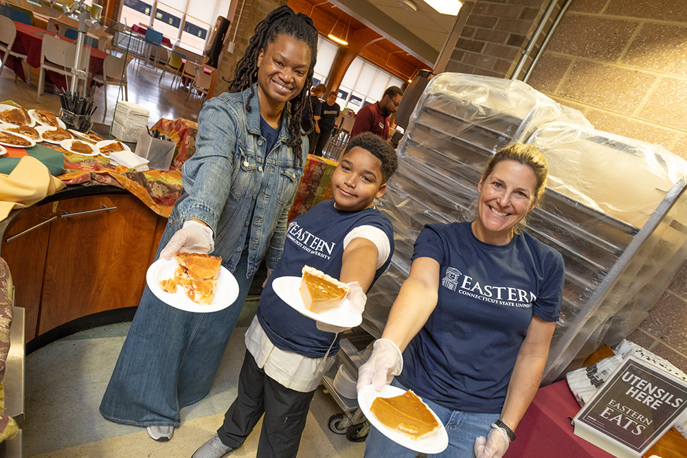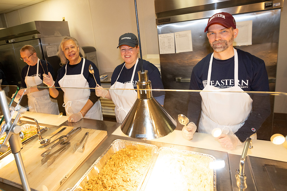 Food for the Day of Giving was donated from the University, Eastern Eats, Sysco Connecticut, Sardilli Produce, Sun Roasters Coffee, Duva Distributors, and Dawson Florist. The food was prepared by Eastern Eats, the University’s dining service, and included roasted turkey breast, mashed potatoes, stuffing, gravy, green beans and carrots, tossed salad, cranberry sauce, pies, cookies, and brownies.