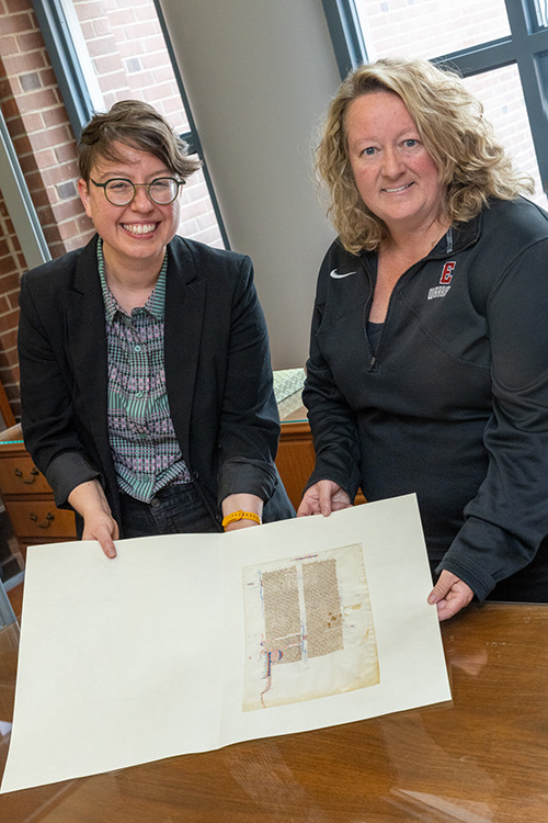 A curation effort by a team of faculty members at Eastern Connecticut State University recently brought two medieval artifacts to the University Archives and Special Collections. Located on the fourth floor of the J. Eugene Smith Library, the archive now houses a leaflet from a 13th-century Bible and an exact copy of a 14th-century prayer book.