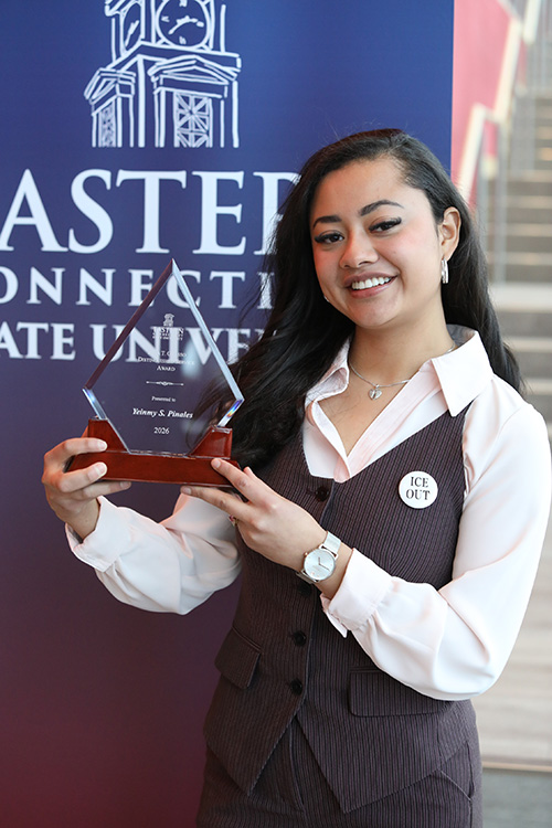 Senior criminology major Yeinmy Pinales won the Ella T. Grasso Award. Her advocacy is heavily influenced by her experience as an immigrant, and she dedicated her award to everyone who has entered the country hoping to make a difference.