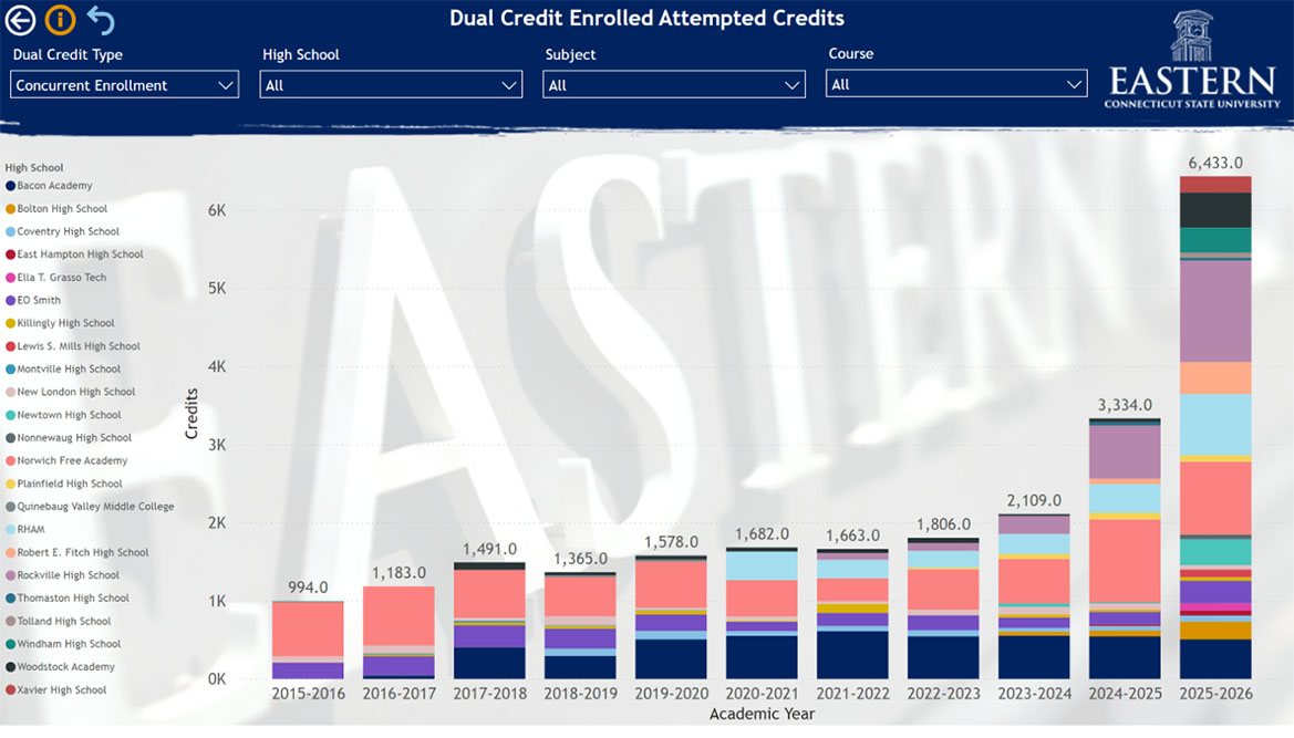 More students are taking more courses as the program grows: the number of credit hours taken has tripled from 2,109 in 2023–24 to 6,433 credits in 2025–26. Since Eastern’s concurrent enrollment program began in 2015, 5,242 students have taken more than 24,000 Eastern credits.