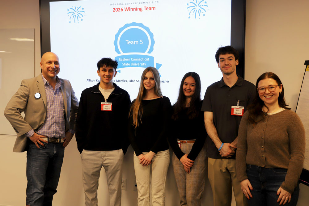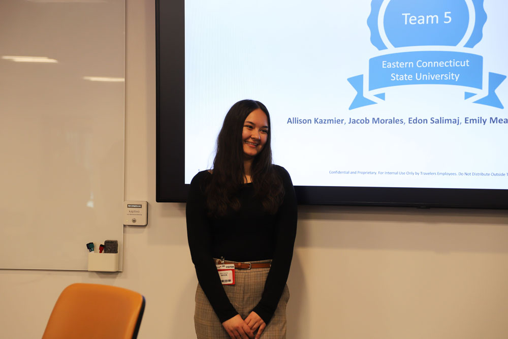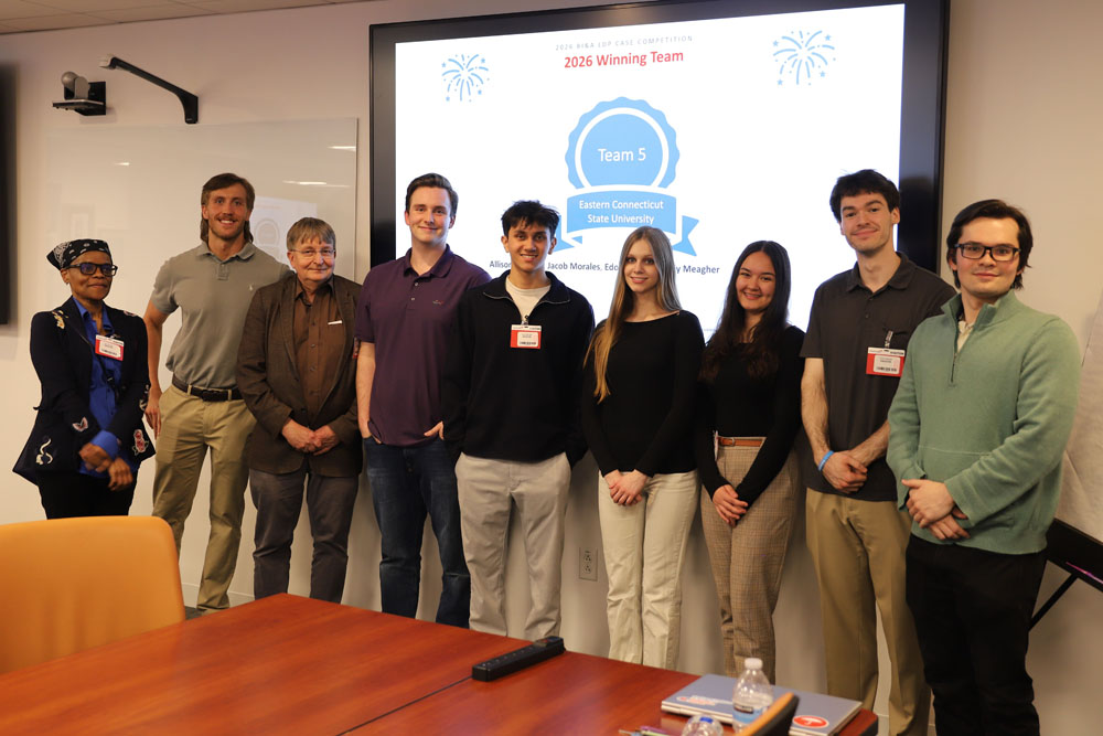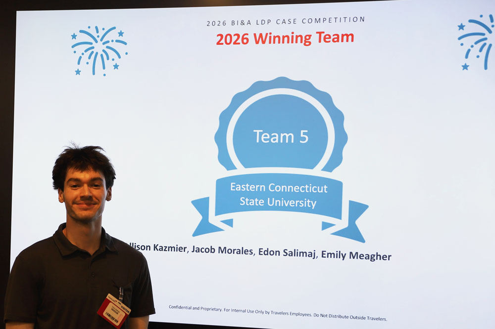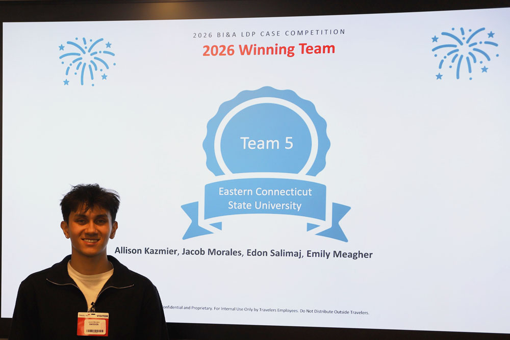 Four undergraduate business information systems (BIS) students outperformed acclaimed business schools at a business analytics case competition on April 3 at Travelers in Hartford. The team earned first place, facing fierce competition from five teams from four other institutions: UConn, Quinnipiac University, the University of Hartford, and Central Connecticut State University.
