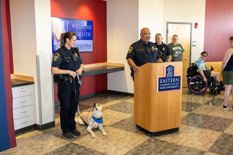 Goliath can be seen on campus during his shifts with Officer Beverly Brown, who helped bring the dog to Eastern through Canine Companions, a non-profit organization based in New York that trains service and facility dogs.